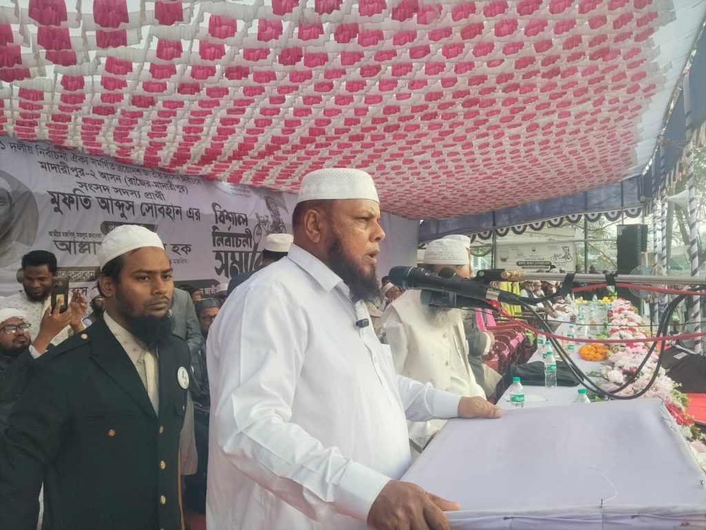 ত্রয়োদশ জাতীয় সংসদ নির্বাচনকে সামনে রেখে ১১ দলীয় নির্বাচনী ঐক্যের দৃঢ় প্রত্যয় ও শক্ত অবস্থানের বার্তা নিয়ে মাদারীপুর-২ (রাজৈর–মাদারীপুর) আসনে এক বিশাল নির্বাচনী সমাবেশ অনুষ্ঠিত হয়েছে। ১১ দলীয় নির্বাচনী ঐক্য সমর্থিত সংসদ সদস্য প্রার্থী মুফতি আব্দুস সোবহান-এর উদ্যোগে আয়োজিত এ সমাবেশে বিপুল সংখ্যক নেতা-কর্মী ও সাধারণ জনগণের স্বতঃস্ফূর্ত উপস্থিতি লক্ষ্য করা যায়।সমাবেশে প্রধান অতিথি হিসেবে বক্তব্য রাখেন—আমীরে মজলিস, মজলুম জননেতা আল্লামা মামুনুল হক, আমির, বাংলাদেশ খেলাফত মজলিস। তিনি বলেন, দেশ ও জাতির মুক্তির জন্য ইসলামী নেতৃত্ব ও ঐক্যবদ্ধ আন্দোলনের বিকল্প নেই। জনগণের ভোটের মাধ্যমে ন্যায়ভিত্তিক রাষ্ট্র প্রতিষ্ঠার আহ্বান জানান তিনি।সমাবেশে সভাপতিত্ব করেন—মুফতি আব্দুস সোবহান,ভারপ্রাপ্ত সভাপতি, বাংলাদেশ খেলাফত মজলিস, মাদারীপুর জেলা শাখাএবং সংসদ সদস্য প্রার্থী, মাদারীপুর-২ (১১ দলীয় ঐক্যজোট)।সভাপতির বক্তব্যে মুফতি আব্দুস সোবহান বলেন,